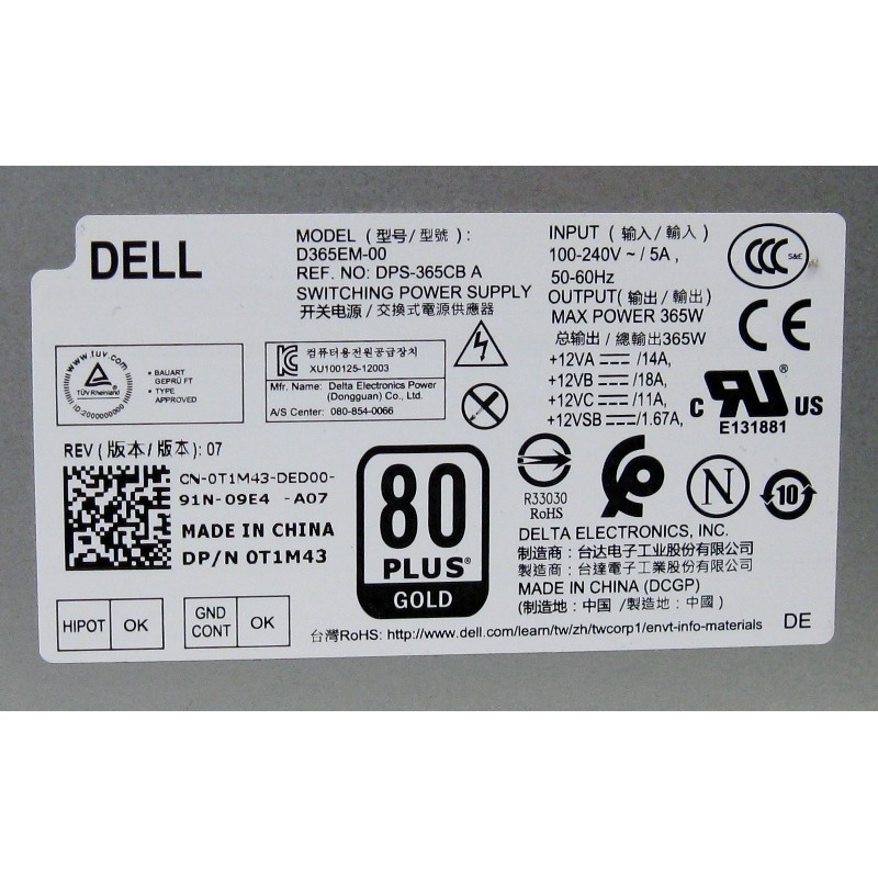 PSU 365W 80PLUS GOLD Dell 0T1M43 Mod D365EM-00 Delta Electronics DPS-365CB A