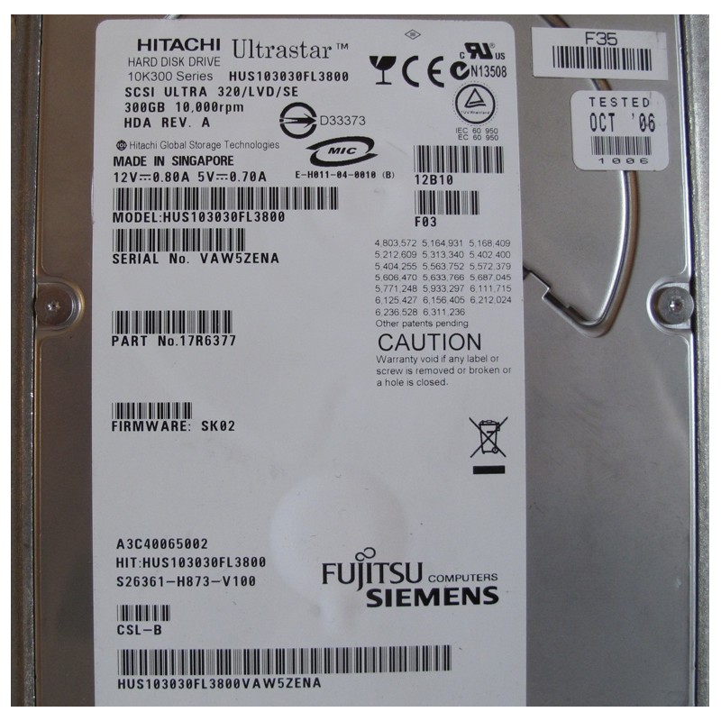 Disque FUJITSU SIEMENS 3"5 A3C40065002 300Go SCSI 320/LVD/SE SCA HITACHI HUS103030FL3800 livré avec support serveur FUJITSU SIEMENS